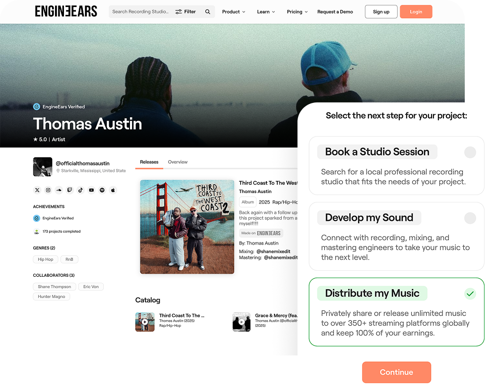 EngineEars is the only platform that offers an unparalleled ecosystem, enabling artists and labels to create, manage, grow, and monetize their music catalog. Sell and distribute unlimited music to over 350+ global streaming platforms while keeping 100% of your earnings.