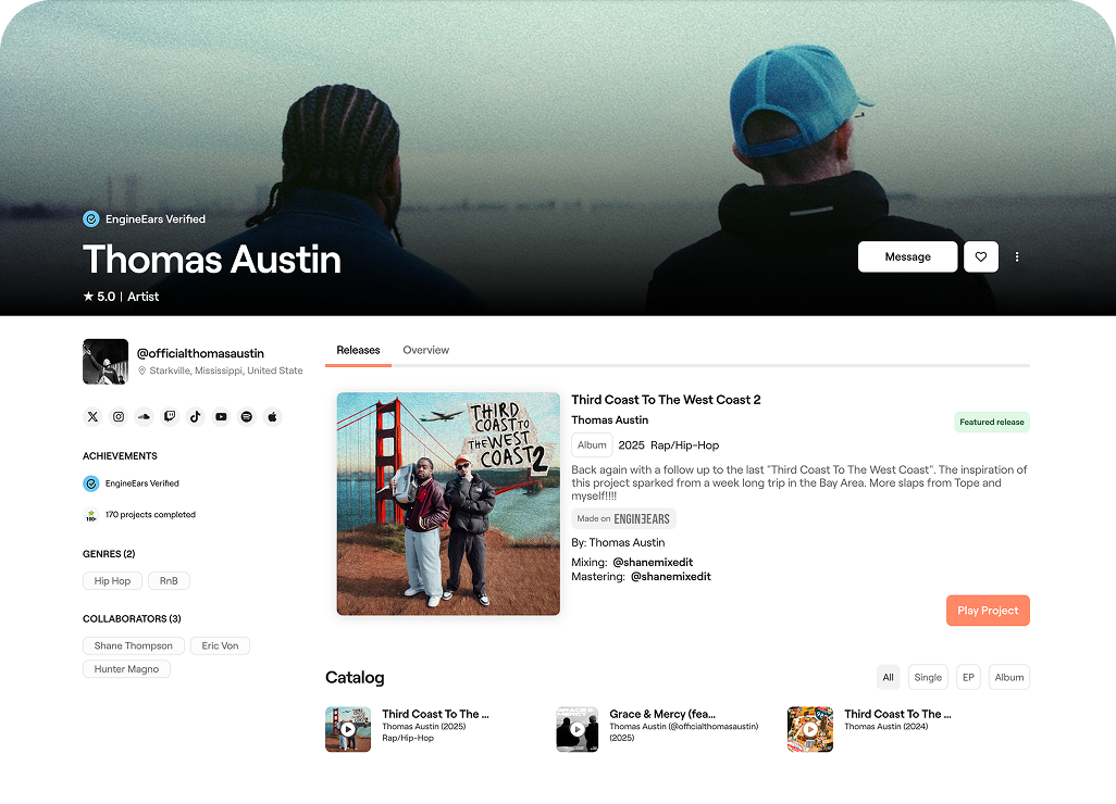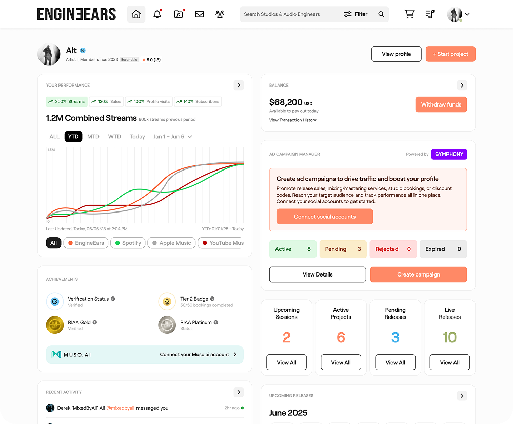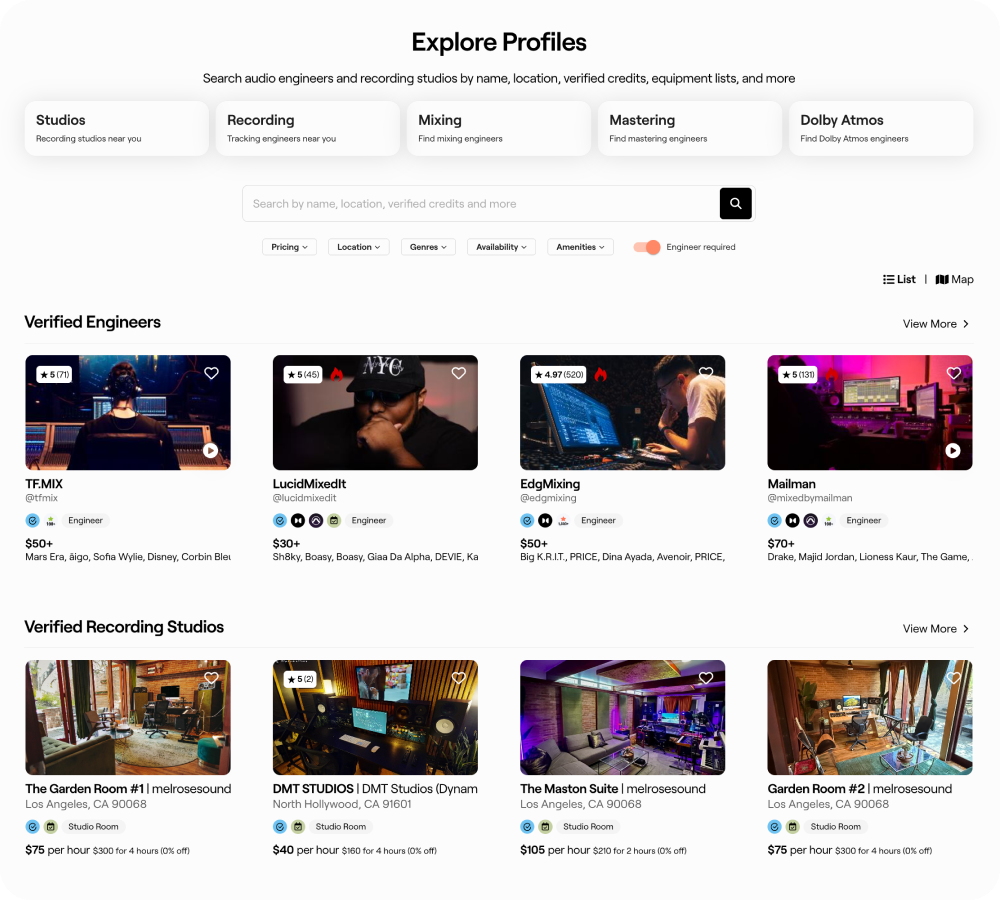 From Hourly Recording Time, to Mixing, Mastering & Dolby Atmos Services; EngineEars hosts some of today’s top music professionals and studio locations available for booking.