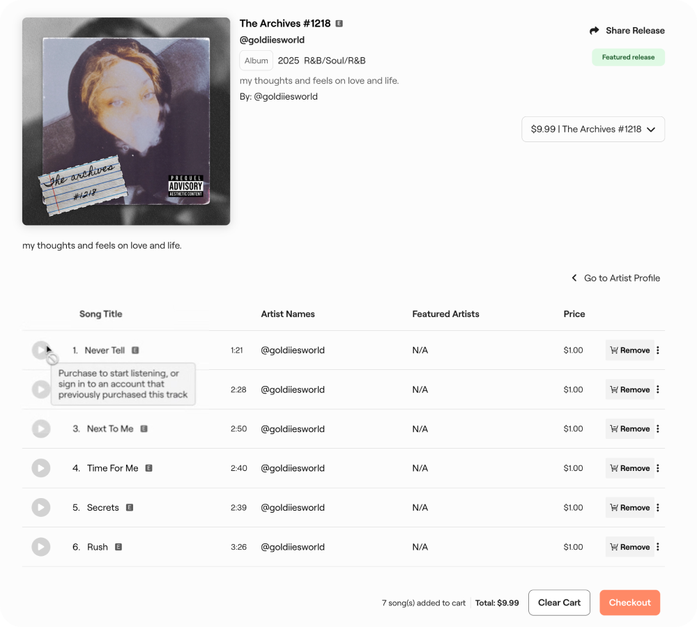 Allow your fans to ‘Pay What They Want’ when supporting your new release. Create bundles that include your music along with merchandise like clothing, vinyl records, CDs, limited edition items, and more.